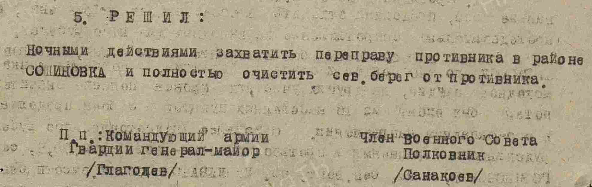 Командующему 46 Армии энергично развивать наступление в общем направлении Починно-Софиевка, Чаплинка, 21.09 – выйти на Александровка, Николаевка. 22.09 – Хуторское, Горяновские; 23.09 —овладеть переправами на р. Днепр в районе Аулы, Днепродзержинск, Тритузная; 24.09 – форсировать р. Днепр и захватить плацдарм на участке Мироновка, Благовещенка. Переправочные средства иметь при войсках».