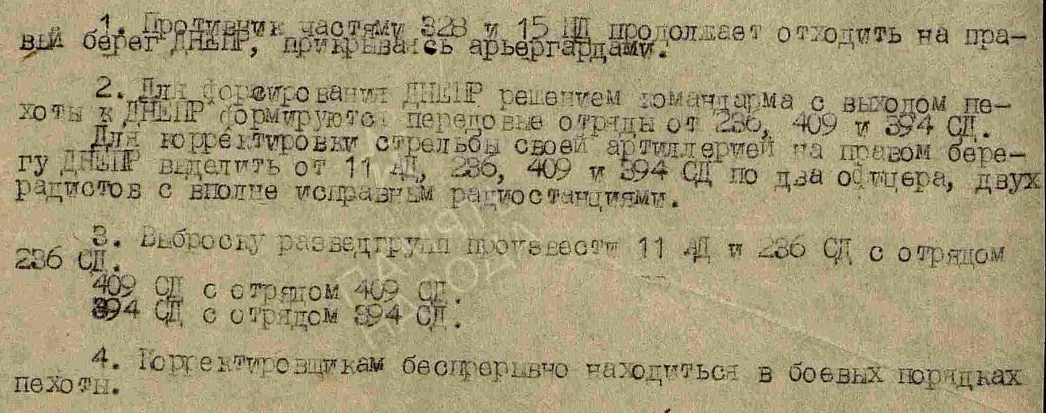 * * *409 СД – передовыми отрядами на подручных средствах переправилась на правый берег р. ДНЕПР в район южнее КУРИЛОВКА и под сильным огневым воздействием с южного берега успеха в дальнейшем форсировании основных своих сил не имела. Передовые отряды заняли 3 острова I км севернее г. ДНЕПРОДЗЕРЖИНСК и закрепились для дальнейшего форсирования с наступлением темноты.