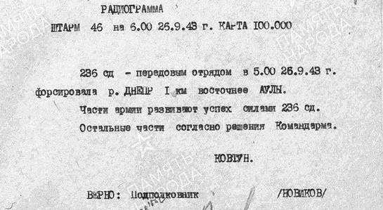 В радиограмме (РГ) 46 А 26.09 на 05.00 [d19], ШТАРМ докладывает, что передовой отряд 236 СД форсировал Днепр 1 км восточнее Аулы.