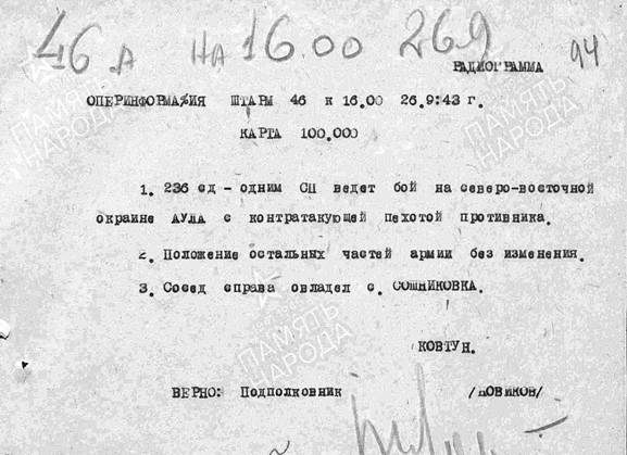 АЖ: Части Армии на своем правом фланге в ночь на 26.9 произведя частичную перегруппировку в полосе Армии, частью сил 236 СД в 3.30 26.09 форсировали р. ДНЕПР в районе АУЛЫ и овладели восточной окраиной СОШИН0ВКА и северной окраиной АУЛЫ, продолжая вести бой за расширение плацдарма на южном берегу.