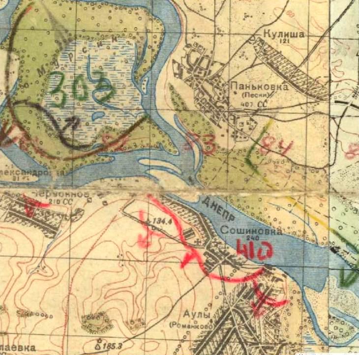 0пираясь на выгодные позиции, подготовленные им на выс.185.3, линия железной дороги и населенный пункт АУЛЫ, противник направил одну за другой контратаки при поддержке мощного артиллерийского огня, имея попытки потеснить части к р. ДНЕПР.