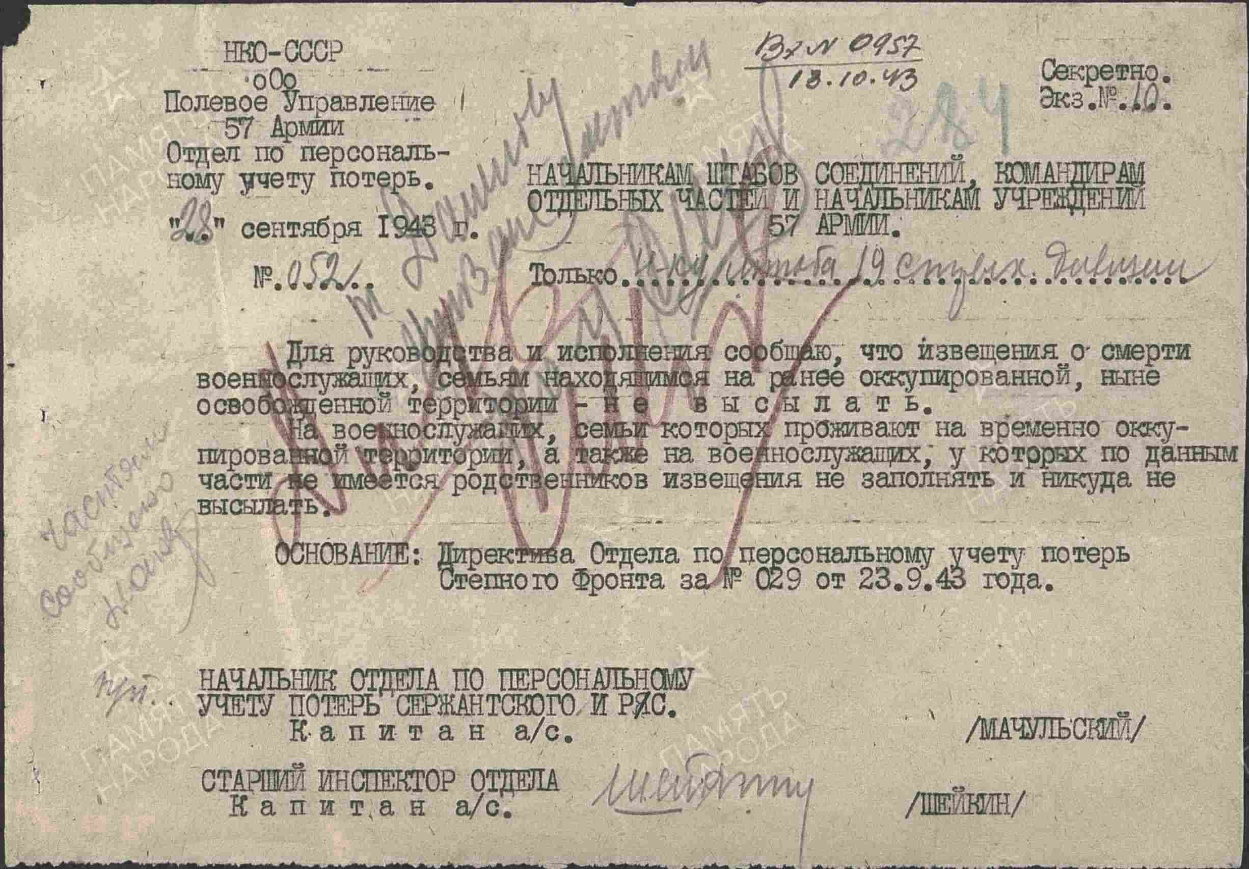 Ж509 02.10. Полк находился на ранее занятом рубеже. Противник имел две попытки контратаковать боевые порядки полка. Сильным ружейным и минометным огнем обе попытки отбиты.