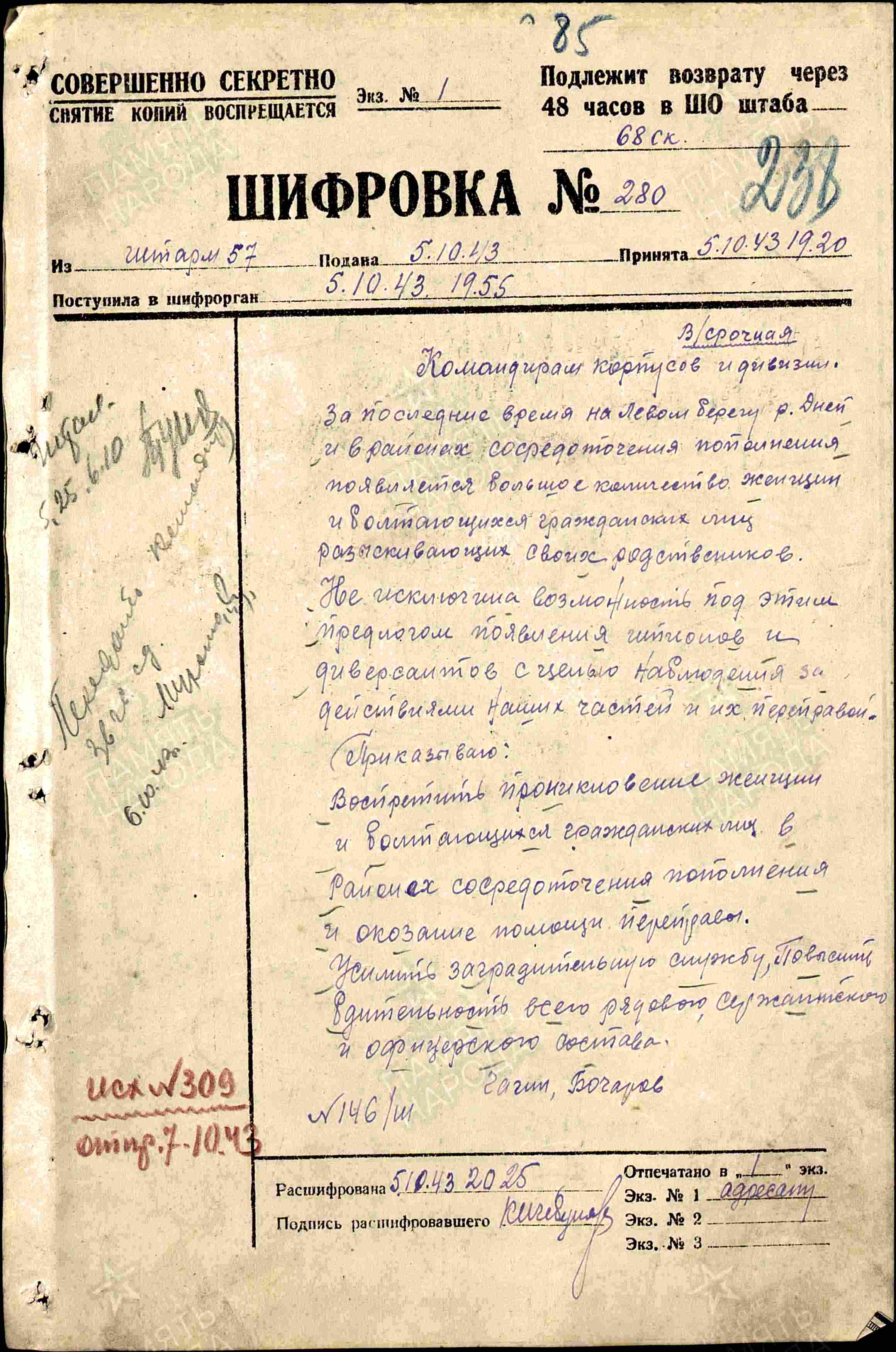 * * *Ж509 25.09. Подразделения полка в течении дня отдыхали и подготавливались к форсированию р. Днепр. В 6-00 совершили марш по маршруту Елизаветинка-Богдановка и в 6-00 сосредоточились в новом районе дислокации. В 20–00 согласно приказа командира дивизии сформированный отряд выступил на исходное положение для форсирование р. Днепр и в 22–00 отряд сосредоточился в районе 1 км северо-западнее Сошиновка.