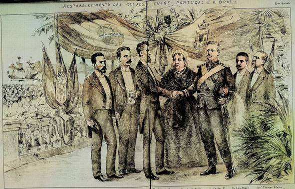 Президент Бразилии Пруденте де Мораиш обменивается рукопожатием с королем Португалии Карлосом I во время восстановления дипломатических отношений между Бразилией и Португалией после переговоров при посредничестве королевы Соединенного Королевства Виктории, 16 марта 1895 года.