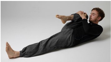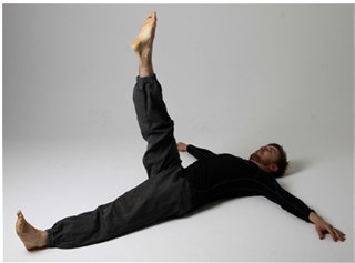 1. Лёжа на спине, на вдохе поднимите правую ногу вверх и вытяните, затем на выдохе согните её в колене; на вдохе обхватите колено руками и прижмите к груди; подтянитесь к колену подбородком.