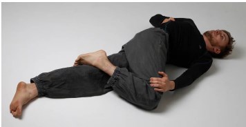3. Повернитесь на бок, нижнюю ногу вытяните, а верхнюю согните в колене и, стопой зацепив за подколенную ямку вытянутой ноги, положите колено на постель спереди. Зафиксировав ноги в этом положении, рукой, которая снизу, захватите сверху бедро над коленом согнутой ноги, а рукой, которая сверху, – туловище сзади. Таким образом вы создадите рычаг для вытягивания позвоночника при развороте туловища. После этого постепенно разворачивайте туловище на спину, вытягивая таким образом позвоночник и тазобедренные суставы.