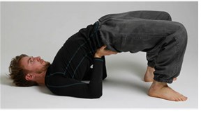 5. Лёжа на спине, согните ноги в коленях и, опираясь на лопатки и стопы, как можно выше поднимите таз, поддерживая его руками. Несколько раз покачайте тазом из стороны в сторону.