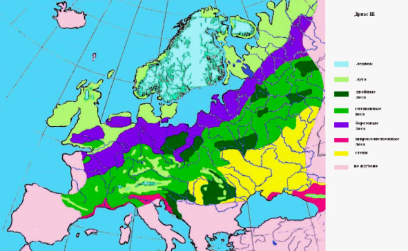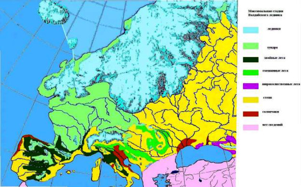 В это время на территории Англии и Ирландии, свободной от ледника, простирались приатлантические тундры и субарктические луга. Березовое редколесье (парковая тундра) было распространено в западной части Европы, а редколесье с березовым и березово-сосновым древостоем занимало большую часть Средней Европы и затем сравнительно узкой полосой шло вдоль побережья будущего Балтийского моря, а тогда Балтийского ледникового озера, на северо-восток. Настоящих лесов, или как их называют «типичных лесных бореальных формаций», в западных и средних частях Европы в ту пору было очень мало, и они находились в основном в долинах крупных рек и межгорных котловинах. В пределах Русской равнины леса занимали, в отличие от Западной Европы, большую площадь в виде широкой полосы, пересекающей ее в направлении с юго-запада на северо-восток. Это были березовые, сосновые, еловые и пихтовые леса. Палеогеографы отмечают, что: «в ряде районов здесь уже существовали леса с участием таких широколиственных пород, как дуб и вяз… в южной части Русской равнины была распространена растительность степного типа». 27 Интересно отметить, что во время максимума Валдайского оледенения, когда почти вся территория Англии была покрыта ледником, а пригодные для жизни участки представляли собой тундру и арктические луга, первобытные люди и такие животные, как волк, пещерный медведь, шерстистый носорог, северный олень, бык и мамонт обитали всего в 50 км. от края ледника. В то же время в бассейне Верхней Волги были распространены луговые степи с елово-березовыми и сосновыми лесами. В бассейне Оки во время максимума оледенения шумели елово-сосновые леса северо-таежного типа. В районе деревни Покровской на р. Пучка (вблизи от оз. Кубенского, на 60°с.ш.) непосредственно у края ледника росло около 38 видов цветковых и споровых растений, а редколесье состояло из березы, ели, лиственницы.