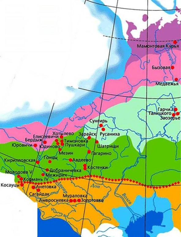 Надо заметить, что в текстильном декоре многих народов Евразии такое традиционное сочетание красного и белого дожило до 20 века. И особенно это характерно для восточнославянской орнаментики вообще и северорусской, в частности. Именно в такой строгой и древней красно-белой цветовой гамме выполнены орнаменты «прелестного комплекса свастических знаков в узорах северорусских искусных мастериц», в которых, по убеждению В.А.Городцова, «скрывается живое воспоминание о самых древних общечеловеческих символах». «И канал свежая, какая твердая память!» – восклицает исследователь.25 И это не удивительно. Изучавший мезинскую верхнепалеолитическую стоянку И.Г.Шовкопляс считал, что общность орнаментальных комплексов свидетельствует о родстве групп, использующих эти комплексы. Он полагал, что население Костенок II на Дону, Мезинской стоянки в Поднепровье и восточносибирских стоянок Мальта и Буреть было близкородственным. Он пишет: «… очень далеким переселением отдельных групп восточноевропейского позднепалеолитического населения, возможно также происходившего из Среднеднепровского бассейна (среднеднепровской этнокультурной области), вероятно, следует объяснить и нахождение в Восточной Сибири стоянок Мальта и Буреть, чрезвычайно близких и даже тождественных во многих проявлениях их материальной и духовной культуры (кремневые орудия, изделия из кости, характер жилищ и т.д.) со стоянками Среднеднепровского бассейна, прежде всего с той же Мезинской. Не исключено, что обитатели стоянок мезинской культуры в Среднеднепровском бассейне, с одной стороны, и названных сибирских стоянок – с другой, имели общее происхождение и даже составляли какое-то время одну группу населения на раннем этапе их истории». 26 К выше цитированному следует добавить также и то, что инвентарь верхнепалеолитической Бызовой стоянки, находящейся в 175 км от Полярного круга, отстоящей от нас на 25—29 тысяч лет, имеет много общего с комплексом нижнего слоя Костенок I, 12 на Дону и относится к тому же времени, что, согласно выводам И.Г.Шовкопляса свидетельствует о генетическом родстве человеческих коллективов, оставивших эти стоянки. В настоящее время для большинства исследователей заселенность Урала и Приуралья в конце мологошекснинского времени представляется бесспорной.
