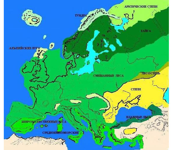 Надо отметить, что собственно тундровый тип растительности в Восточной Европе представлял собой сравнительно узкую полосу, идущую вдоль границы Скандинавского ледникового щита. Но в Центральной Европе тундры занимали, судя по всему, «всю полосу между Скандинавским ледниковым щитом на севере и Альпийским ледником на юге, а в приатлантической части их распространение было еще большим». 28