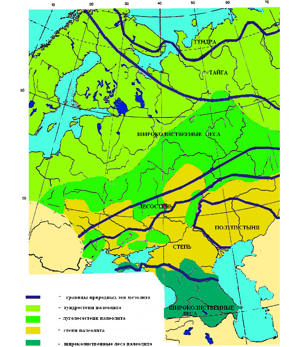 В этом нет ничего неожиданного, ведь люди шли давно проторенным путем. Вспомним, что анализируя инвентарь верхнепалеолитических стоянок Поднепровья (мезинская культура), Дона (Костенки), Сибири (Мальта и Буреть) и Печоры (Бызовая стоянка), исследователи предполагали генетическое родство человеческих коллективов, оставивших эти стоянки. Кроме того, значительные площади севера Русской равнины, находившиеся между восточной границей ледника (мологская лопасть) и Уральским хребтом, покрытые и в пик ледника смешанными лесами и луговыми злаковыми степями, вряд ли были покинуты людьми. В эпоху мезолита с улучшением климатических условий, с увеличением зоны широколиственных лесов численность населения на этих территориях должна была, естественно, увеличиться, т.к. именно широколиственные леса «обладают высокой биологической продуктивностью и исключительно благоприятными условиями для добывания растительной и животной пищи». 38 В эпоху мезолита практически вся территория Ленинградской, Новгородской, Тверской, Ярославской, Костромской, Вологодской областей, Карелии и значительная часть Архангельской области находились в подзоне широколиственных лесов.
