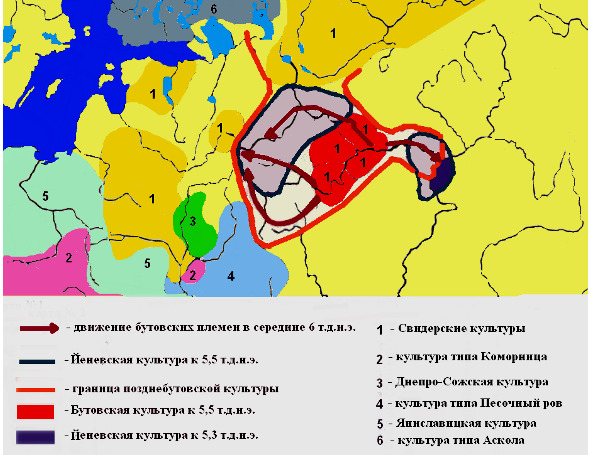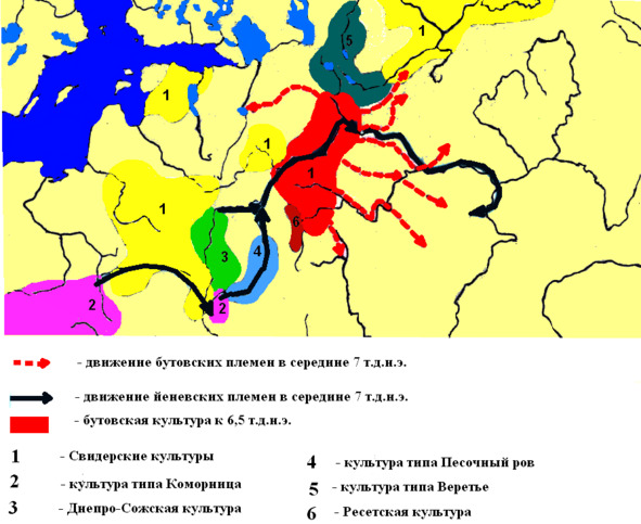 Со второй половины 7 тыс. до н.э. до второй половины 6 тыс. до н.э. в Волго-Окском бассейне распространились племена иеневской культуры, пришедшие с территории Верхнего Поднепровья и Подесенья и вытеснившие бутовцев с их исконной территории на север и северо-восток. Но уже во второй половине 6 тыс. до н.э. потомки изгнанных бутовцев в свою очередь вытесняют иеневское население и возвращаются на свои исконные земли. В это же время на Каме появляется население усть-камской культуры, предположительно родственное иеневскому, продвинувшемуся на восток из бассейна Верхнего Днепра.45