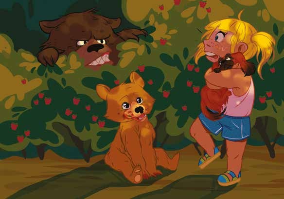 Каня так развеселилась, что не заметила на дороге корягу, запнулась и кубарем полетела в кусты. За ней, истошно тявкая, бежала Лямка. Когда Каня поднялась на ноги, то увидела густой малинник, из которого вылезал бурый медвежонок, весь перепачканный малиновым соком.