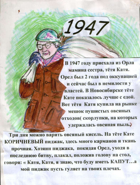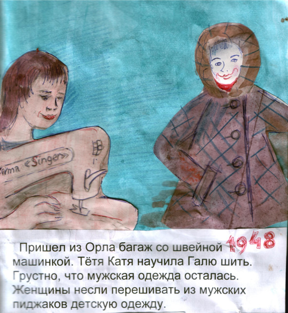 Из Орла приехали две сестры – Екатерина и Мария с ребенком- Витей. Они спали на широких полатях, куда была сделана удобная лестница, на ней можно было детям заняться физкультурой, а взрослым- можно было посушить белье. Скоро пришел багаж из Орла. Там была швейная машина марки Зингер. Не было даже мысли, что нанять транспорт. Так и везли швейную машину на своих маленьких колесиках от самого вокзала в далекий Дзержинский район. Пришли вещи теток. Там был коричневый китель немецкого солдата, который в числе трех других квартировал в доме тетки. Немец был высок, а тетка маленького роста. Но трудно было переделать эту крепко сшитую форму. Тётя Катя только отпорола знаки различия, укоротила рукава. На воротник пришила кусок шарфа и лихо носила эту одежду, как удобный плащ, где было много карманов. В Сибири не знали эту форму, она не промокала и долго служила ей.