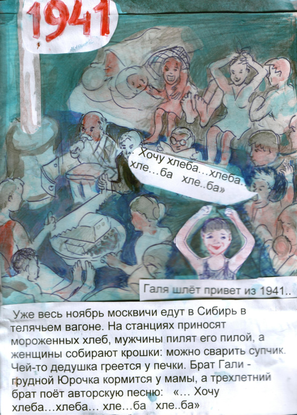 Много чего вспоминалось. Когда ехали в товарных вагонах, приносили на станциях мороженый хлеб. Мужчины пилили его пилой, а женщины подставляли простынь, чтобы собрать крошки и сварить супчик. А трехлетний брат Женя все время пел однообразно и ритмично: «Хлеба, хлеба, хлеба, хлеба, хле-е-е б-а… Хлеба, хлеба, хлеба, хлеба, хле-е-е б-а…»