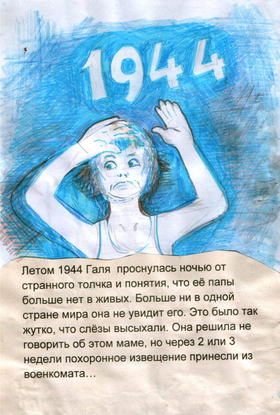 Семья переехала в барак. Это был длинное деревянное одноэтажное здание, внутри которого были комнаты по сторонам. Когда весной, на другой год, копали под огороды землю вокруг, то в земле попадались свежие смолистые щепки. Перегородки между комнатами были из досок. И можно в щели спрашивать, сколько времени или попросить в щель соль. На другой год их стали обивали дранками, и покрывать раствором из глины, смешанной с конским навозом. Весной в солнечных углах комнаты проросли стебельки овса, который оставался в навозе. Жизнь продолжалась! Но вот только синий олень с большими рогами, которого отец Гали нарисовал на белой стене уходил вдаль. И это было плохим символом. Отцу прислали повестку после того, он как поссорился с начальством. Он ушел на фронт и погиб летом 1944 года, в возрасте тридцати одного года. В его артиллерийскую батарею упал немецкий снаряд.