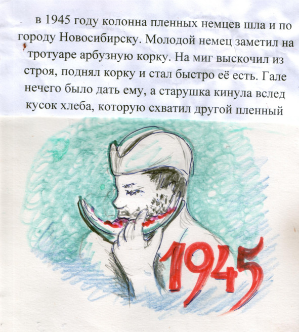 Война закончилась, однажды Галя видела, как по шоссе шла колонна пленных немцев. Это были жалкие усталые люди, один парень увидел арбузную корку, быстро поднял её и стал ее жадно есть. Кто-то кинул кусок хлеба, его перехватил тут же другой пленный.
