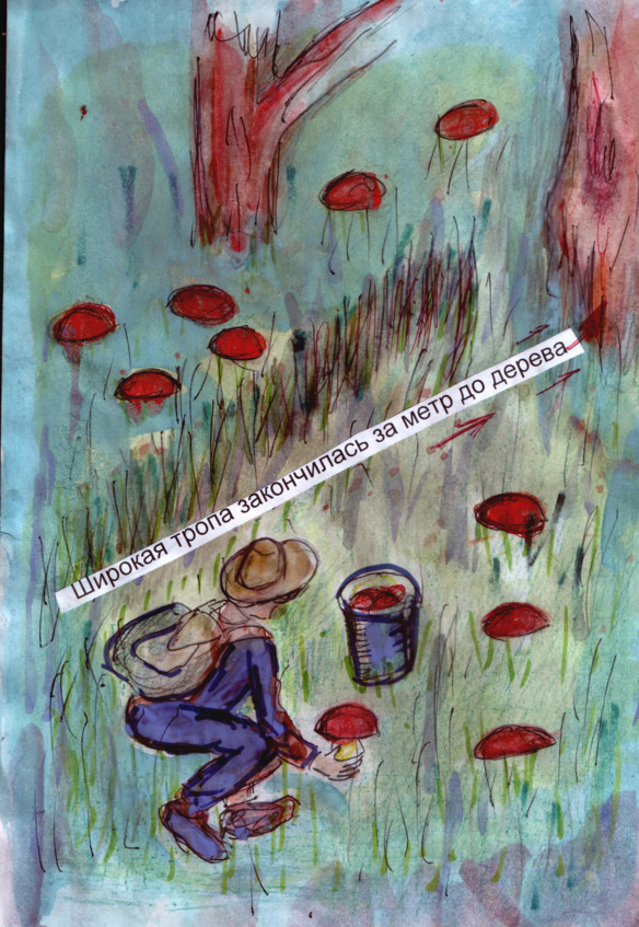 Вот и горы почти кончились, до следующего горного массива лежал участок прекрасного ровного леса, где редко росли большие деревья, ровная высокая трава, из которой в большом количестве выглядывали шляпки белых грибов. Это так тайга приготовила подарок! Грибы были большие и крепкие. Это из-за толстой листовой подстилки. Похоже, что Галя радовалась больше всех. Она помнила, как папа брал её за грибами. У неё было ведро, и хотелось собрать полное ведро грибов, чтобы порадовать друзей за ужином. Она отрезала ножки от шляпок, чтобы больше вошло в ведро. При этом она так увлеклась, как и её друзья. Возможно, что ни она, ни её спутники не заметили, как она отстала. Галя и не беспокоилась, так как видела рядом широкую тропу, по которой, как она думала, и шли её спутники. Далеко они не уйдут, потому что темнело, и скоро желанный отдых у костра и ночлег в палатке. Галя обрадовалась и, побрякивая ведром, к которому была привязана кружка, шла весело по этой тропе, предвкушая, какую вкусную еду она сейчас приготовит, уж грибы она готовит особенно вкусно. Но вот тропа уперлась в ствол толстого кедра. И тут Галя медленно стала понимать, что по тропе шел медведь, который с этого места поднялся на ствол. Медведь тоже ел здесь грибы, похоже, что это была его поляна, удобряемая им каждое лето. Да, это так и есть, вот и лепешка фекалии упала с дерева, рядом с девушкой.