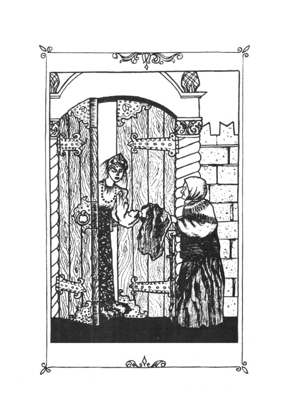 Выходит навстречу старшая дочь Марья. На ней подзатыльник жемчужный на банберене, перстни с яхонтами и изумрудом, будто у королевы.