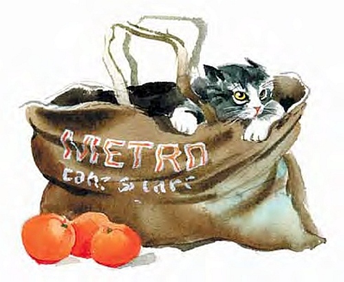 «А я-то как?» – мяукал Валенок. Но его гладили по шёрстке, а понимать не понимали. И тогда решился Валенок на крайнюю, отчаянную меру: ночью забрался в походную дяди-Славину сумку, под пакет с гостинцами.