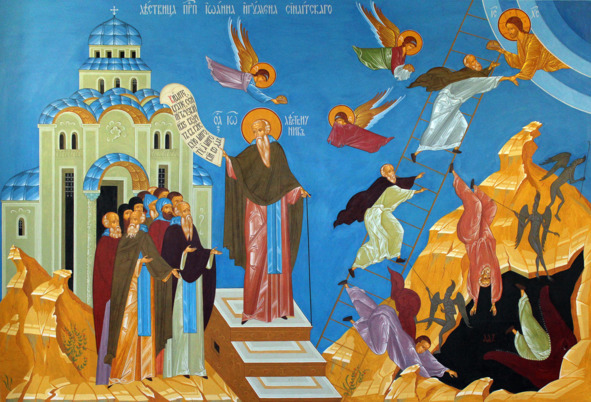 Вперёд и вверх – это бы хорошо, да сила тяжести не пускает. Тяжесть – трудное слово, тянет вниз, взлететь не даёт, сутулит плечи, путает ноги. Но она есть данность, наше испытание – без неё никуда. Значит нужна опора, нужна лестница или, как её раньше называли – лествица, лествица духа. Собственно, притяжение – это просто данность земли матери, от неё мы получаем любовь и кормление на всю земную жизнь. Как всякая мать она долго не хочет отпускать от себя детей своих, но и знает о неизбежности этого события. Когда-то мы оторвёмся от сосцов материнских, а пока лишь неуверенной рукой берём ложку в правую руку и от тарелки вверх ко рту, потому как дело это правильное: слева на право и снизу-вверх. И тело наше от Земли Матери (из праха земного) – соков её, а семя от Отца. Как всякое семя, проклюнувшееся ростком, оно устремляется к Отцу, к Свету, кормясь корнями своими от Земли – Матери в жизни земной. В нашем случае – это устремление души человеческой к духу Отца (небесного) своего. Мать и Отец для души человеческой заботливо выставили лестницу-путь, упёртую нижним концом в Землю, а верхним положенную на твердь небесную. По этой лестнице душа человека проходит сама, через освобождение от пороков и страстей, от энергий первоначального хаоса устремляется к энергиям благодати и покоя в «теле» Бога Отца. Видимо после упокоения, в конце лестницы, нашу душу ждёт другая жизнь, уже не в человеческом чине.