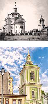 Фото церкви Усекновения главы Иоанна Предтечи в Казенной из альбома Н.А. Найденова и современное фото сохранившейся колокольни. Источник: Яндекс. Карты