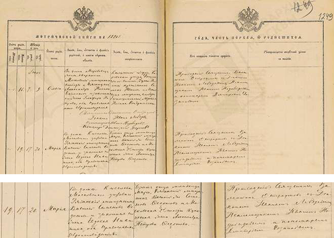Крестными родителями Марии стали ее дядя – рязанский мещанин Василий Семенович Федотов-младший и родственница – жена московского 2-й гильдии купца Александра Петровна Федотова. Она же, уже вдова, вместе с рязанским мещанином Алексеем Васильевичем Федотовым, крестила третьего ребенка Василия и Евдокии – мальчика Николая, который умер через полгода после рождения.