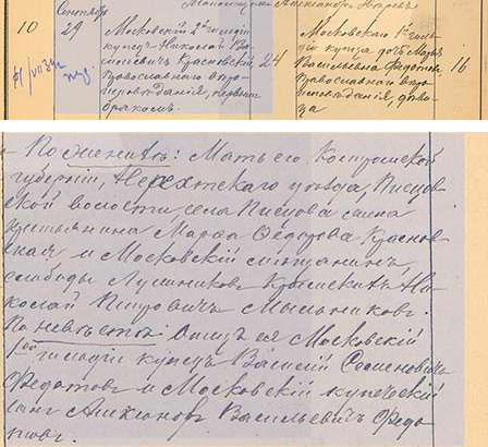 Сам Киселев был неграмотен. Скорее всего, он сдавал комнаты в главном доме и жилые постройки на участке внаем. Мы можем только предполагать, но скорее всего таким нанимателем стал переехавший в Москву мещанин города Рязани Василий Семенович Федотов (1851–1913), который в Москве активно занимался бизнесом, торговал тканями или, как тогда говорили, «мануфактурным товаром». Судя по всему, Киселев и Федотов стали деловыми компаньонами, скрепив свой деловой союз, как тогда часто бывало, родственной связью. 3 сентября 1878 года в Харитоньевской, что в Огородниках, церкви состоялось венчание Василия Семеновича и Евдокии Никитичны. Невесте было 16 лет, а жениху – 27.