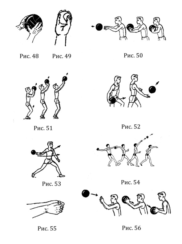 Большой и средний мяч зажимается с двух сторон кистями с широко разведенными пальцами, чтобы всей поверхностью ладони чувствовать мяч (рис. 48). С учетом направления предстоящего броска, пальцы перемещаются по мячу: кверху (бросок вниз и вниз-вперед); книзу (бросок вверх и вверх-вперед) или назад (бросок вперед, вперед-вниз и вперед-вверх), чтобы можно было кистями и пальцами сделать завершающий толчок в нужном направлении.