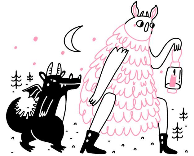 Дракон взмахнул крыльями и полетел в сторону глубокого оврага. Со дна оврага поднимался тоненький, еле заметный дымок. Дракон медленно спланировал к струйке дыма и увидел небольшой костер, а рядом маленькое странное существо, похожее на горку длинных коричневых замшевых лоскутков. Дракон подошел поближе и разглядел под лоскутной шерстью черные глаза, губы трубочкой и треугольные уши.
