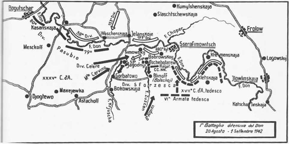 Теперь положение Альпийского армейского корпуса на фронте на Дону было следующим: 2-я венгерская армия своей 23-й дивизией была в контакте с 8-й итальянской армией, на левом фланге дивизия «Тридентина» (генерал Ревербери): 6-й полк альпийских стрелков (полковник Синьорини), батальоны на передовой «Верона», в районе Подгорного на Дону; «Вестоне», во втором эшелоне в Деша со штабом полка, в то время как штаб дивизии и 2-й полк альпийской артиллерии были в Дольшик. Следующий 5-й полк альпийских стрелков (полковник Адами): батальоны «Тирано» (Белогорье), «Эдоло» (Северная Бассовка); потом дивизия «Юлия» (генерал Риканьо) с 9-м полком (полковник Лавиццари), батальоны «Валь Чисмон» и «Чивидале» на передовой, в Русском Бойволове; 8-й полк альпийских стрелков (полковник Чимолино) батальоны на Дону «Толмеццо» и восстановленный «Джемона» севернее Каравут; штаб дивизии в Куреной; 3-й полк альпийской артиллерии напротив Становой. В резерве находились батальоны «Акуила» и «Виченца» в районе Подгорного. Следующая дивизия «Кунеэнзе» (генерал Баттисти) с 1-м полком альпийских стрелков (полковник Манфреди) и батальоны на передовой в Казинке, а именно «Чева» и «Мондови», следующие батальоны 2-го полка (полковник Скримин) с батальонами «Борго Сан Далмаццо) и «Дронеро» в то время как батальоны «Пьеве ди Теко» и «Салуццо» были во втором эшелоне; штаб дивизии в Анновке; штаб 4-го полка альпийской артиллерии в Солонцах. Штаб альпийского армейского корпуса (генерал Наши) в Россоши. Далее II армейский корпус генерала Зангиери…