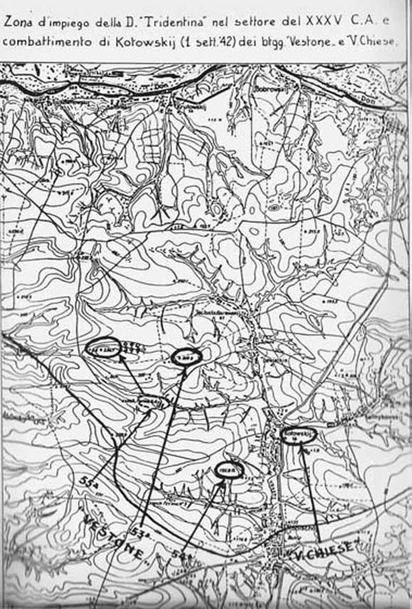 Противник собрал огромные резервы и организовал контратаку из деревни Калмыковская, которая, как полагали в батальоне «Вестоне» находится уже в руках 79-й немецкой дивизии. Это вынудило батальон оставаться изолированным на захваченных позициях и покинуть после тяжелой борьбы высоты 236,7 и 309,6. Батальон «Валь Кьезе» достиг успеха и был на пороге Котовской, открытой для жестокого огня из Калмыковской, и подвергся контратакам одновременно на фронте и на флангах, что все-таки вынудило его отступить.