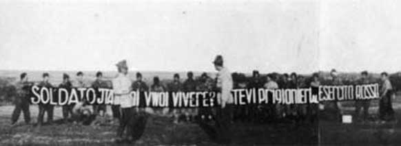 Пропагандистский плакат, развернутый перед позициями альпийских стрелков. На плакате надпись: «Итальянские солдаты, хотите жить? Сдавайтесь в плен Красной армии»