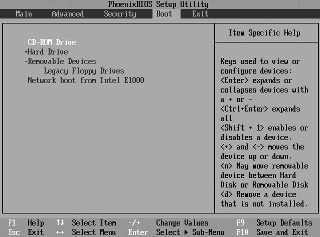Если требуется, чтобы загрузка компьютера начиналась с DVD-привода, нужно сделать так, чтобы позиция CD-ROM оказалась в самом верху. Для этого выделите эту позицию и, нажимая клавишу +, переместите позицию в самый верх, как показано на рис. 3.1.