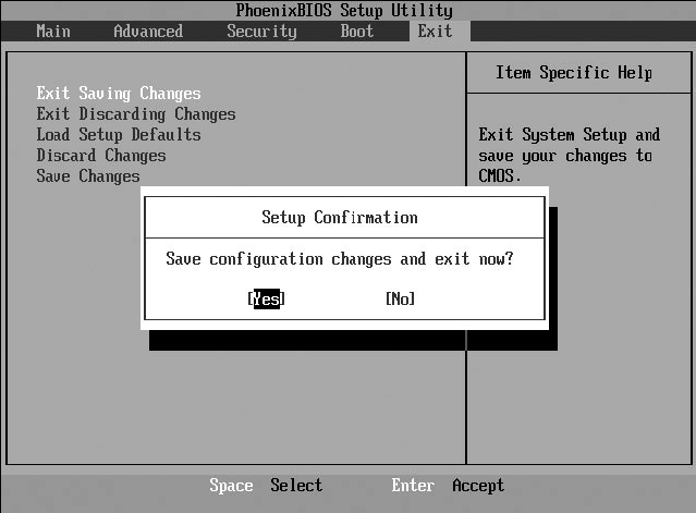 На этом настройка BIOS завершена, и можно выйти из BIOS Setup с сохранением сделанных изменений. Для этого перейдите на вкладку Exit и нажмите клавишу Enter на позиции Exit Saving Changes. В результате появится окно, в котором нужно подтвердить свое решение путем выбора ответа Yes (рис. 3.2). Если этого не сделать, загрузка с DVD-привода или flash-накопителя будет невозможна до тех пор, пока не будут изменены описанные параметры.