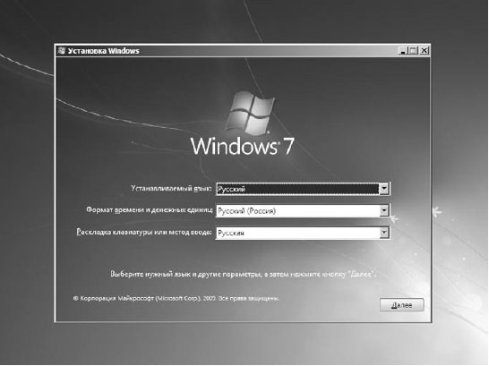 После того как все нужные файлы для начала работы графической среды установки операционной системы будут загружены, появится первое графическое окно, в котором вам будет нужно указать язык интерфейса, раскладку клавиатуры по умолчанию, формат времени и валюты региона, в котором вы проживаете (рис. 4.2).