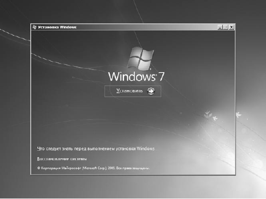 Теперь загрузчик готов приступить к установке операционной системы. Стоит сказать, что диск с дистрибутивом операционной системы используется не только для установки операционной системы, но и для ее восстановления в определенных случаях. Именно поэтому не удивляйтесь, когда в следующем окне вы обнаружите не только кнопку Установить, но и кнопку Восстановление системы (рис. 4.3).