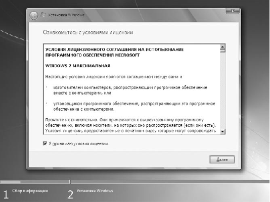После ознакомления с лицензионным соглашением следует его принять, установив флажок Я принимаю условия лицензии. Если этого не сделать, вы не сможете продолжить установку и останетесь без операционной системы. Поэтому сделайте правильный выбор и нажмите кнопку Далее для продолжения процесса установки.