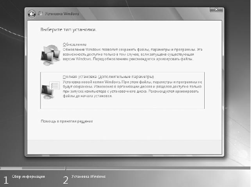 После этого вам предложат на выбор вариант установки – обновление или полную установку (рис. 4.5). Это вполне логичное предложение, если учесть тот факт, что на компьютере уже может быть установлена операционная система одной из предыдущих версий или даже Windows 7, но в более простой версии.