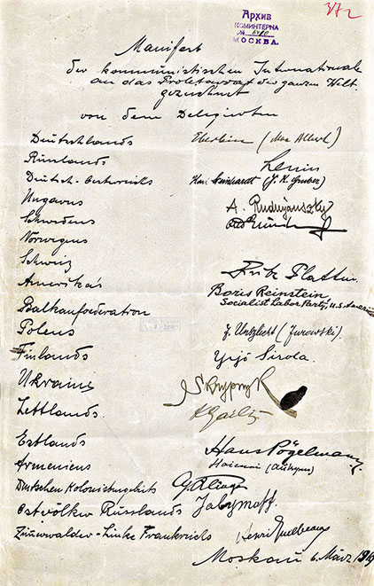 Его учредительный конгресс, созванный в марте 1919 года на пике российской Гражданской войны, являлся ее следствием и подобием. Подготовленный Львом Троцким манифест новой организации утверждал, что империализм привел к концу эпохи национальных государств и революций. Следовательно, и гражданская война, через которую придется пройти пролетариату для завоевания власти, с железной необходимостью будет вестись в мировом масштабе[4].