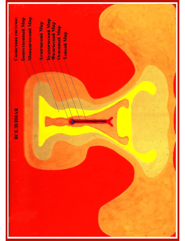 показана совершенно необъятная форма нашей Солнечной системы с её Мирами-сферами. Мы в состоянии видеть только Физический, Плотный Мир нашей системы, который расположен в головной части Тонкого Мира в виде всего лишь миллиметрового кружочка. На изображении 1.