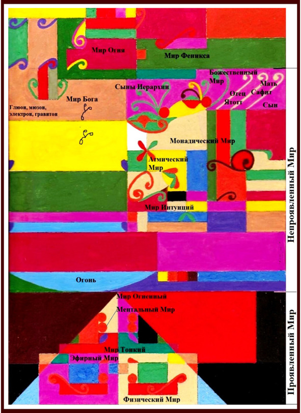 Часто проявленный мир рассматривается как пирамида с вершиной из Огненного Мира, в середине – Тонкий Мир, в основании – Мир Плотный.