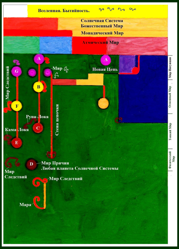 Вначале формируется Первый непроявленный мир, мир Духов. Это четыре сферы: Божественная, Монадическая, Атмическая (Разумная), Буддхическая (Интуиция). Затем создаётся Второй, но уже проявленный мир из трёх сфер (миров), поддающийся человеческому познанию: Огненный, Тонкий и Плотный. 9
