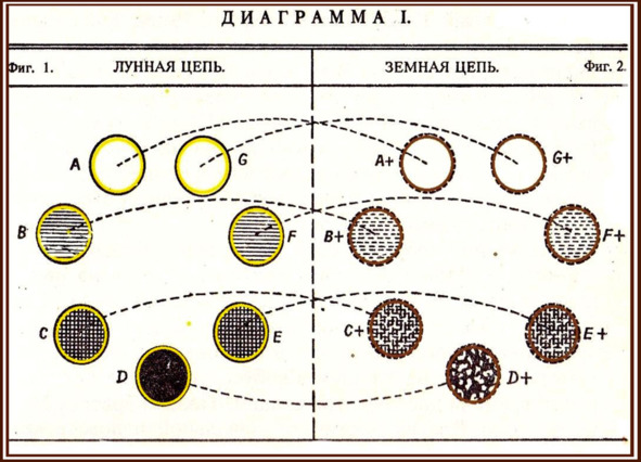 «…В предложенной Диаграмме I. Фиг. 1. представляет Лунную цепь из семи Глобусов в начале её седьмого или последнего Круга; тогда как Фиг. 2. изображает будущую Земную цепь, которая будет, но пока ещё не существует. Семь Глобусов каждой цепи различаются в своём циклическом Порядке буквами от A до G, причём Глобусы Земной цепи, кроме того, отмечены крестом (+), символом Земли…» 29