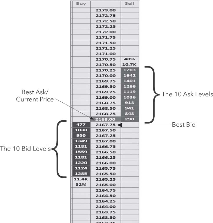 The single most important thing on Nav’s screens was a display called the ladder, which shows trades occurring and orders entering and leaving the market in real time. Also known as the central limit order book, it looks like an Excel spreadsheet with three columns whose contents are constantly shifting. The central column contains twenty price levels, ordered from high to low. They range from nine ticks above to nine ticks below the current ‘best offer’ and ‘best bid’. Next to each level is a figure showing the number of orders waiting ‘in the queue’ to trade at that level. Taken as a whole, the ladder provides an indispensable window into a market’s supply and demand at any given moment.