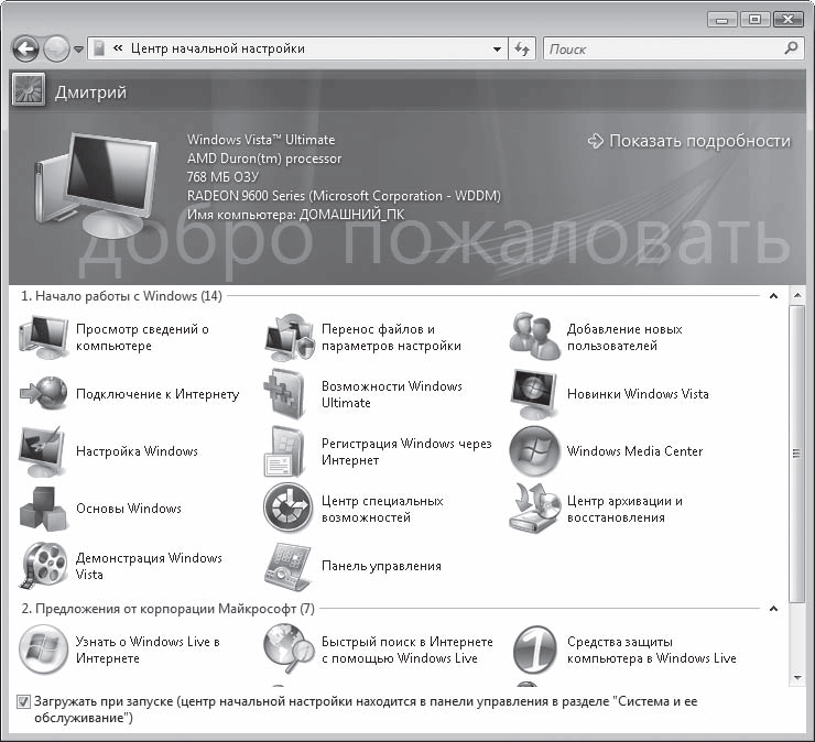Центр начальной настройки запускается автоматически каждый раз после загрузки Windows. Чтобы этого не происходило, снимите флажок Загружать при запуске, расположенный в нижней части окна.