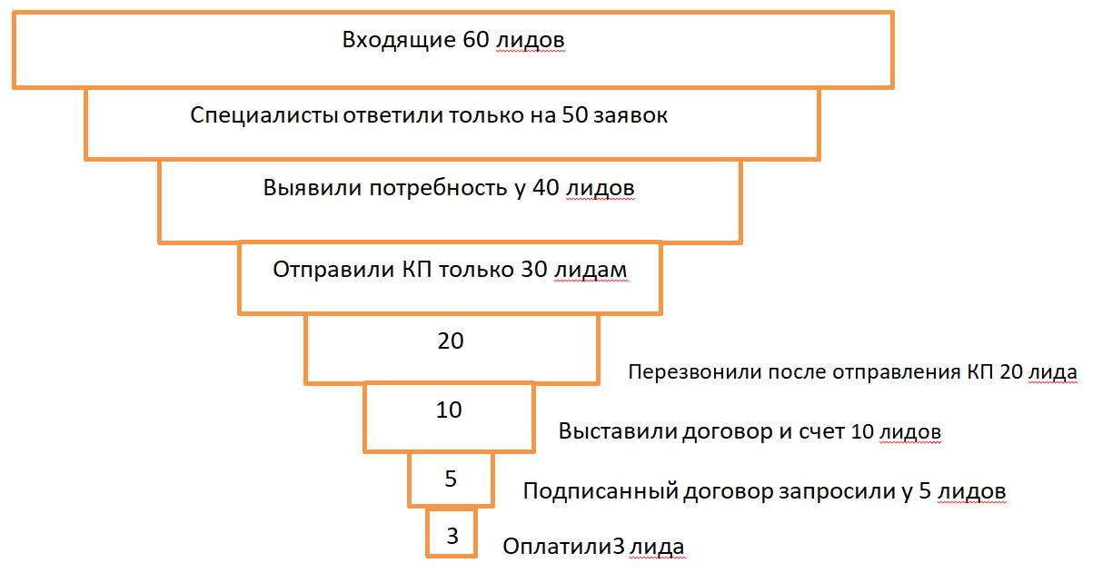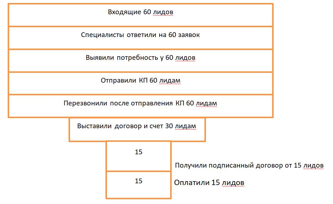 В итоге конверсия из привлеченного лида в оплату всего 5%. В идеале воронка должна была выглядеть, как минимум так: