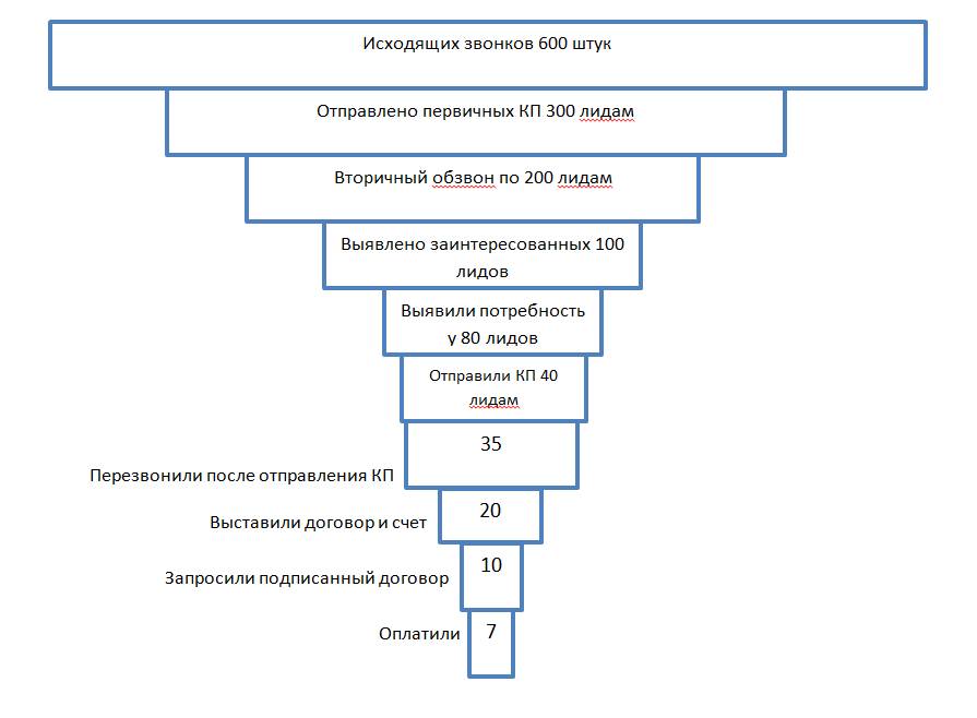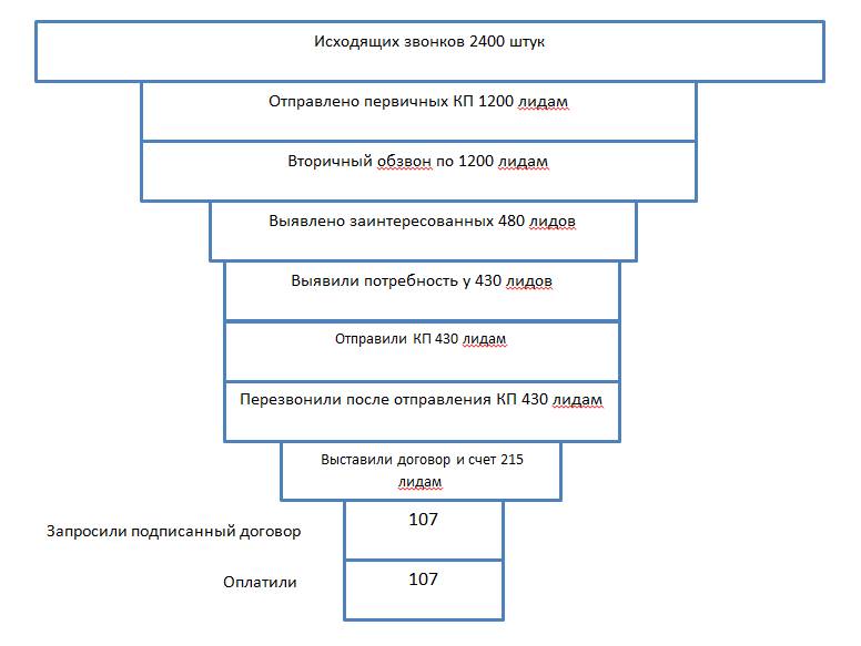 А вот здесь, я вижу узкие места. Раз было отправлено 300 КП, соответственно 300 лидов и надо было повторно обзвонить. Конечно, есть вероятность, что не возьмут трубку или будет номер не доступен. Тогда надо звонить либо с другого номера, либо на другой день. В данном случае конверсия должна быть около 100%.