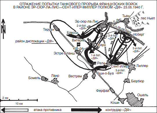 И снова хорошо проявил себя отличившийся ранее в бою за высоту Греббе гауптштурмфюрер СС Хармель, который сумел продержаться до тех пор, пока командир 3-го батальона «ДФ», гауптштурмфюрер СС Кумм, лично не возглавил контратаку своего батальона вместе с резервом 9-й роты при поддержке пулеметного взвода 12-й роты и противотанкового взвода 14-й роты. Менее чем за час в бою под Сент-Илером было подожжено тринадцать вражеских танков и взято в плен около пятисот человек. Однако основная масса вражеских танков атаковала не здесь, а севернее, в районе городка Эр-сюр-ла-Лис. Здесь они натолкнулись на 7-ю роту под командованием смелого и осмотрительного гауптштурмфюрера СС Лингнера.