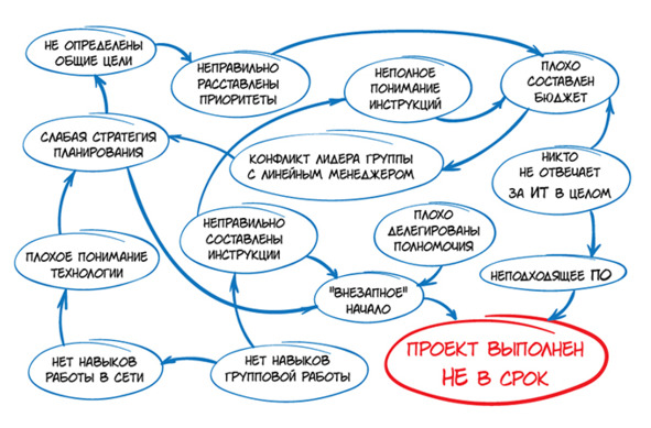 Чтобы разобраться в этой паутине проблем, надо выбрать точку только с исходящими стрелками. Такие точки обязательно найдутся. Это так называемые независимые проблемы. Обычно это вовсе не ключевые проблемы, а что-то вполне рядовое. В нашем примере это точки «нет навыков групповой работы», «плохо делегированы полномочия», «неподходящее ПО» и «никто не отвечает за IT в целом». Когда вы справитесь с какой-нибудь из этих проблем и она исчезнет из жизни и со схемы, вы сможете продвигаться дальше.